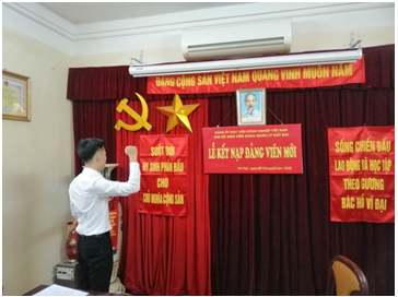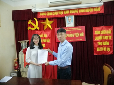 Với các thành tích tốt trong học tập và trong hoạt động Đoàn – Hội, các đồng chí đoàn viên ưu tú đã vinh dự được đứng trong hàng ngũ của Đảng. Trong không khí trang nghiêm khi nhận quyết định từ Bí thư Chi bộ, dưới Cờ Tổ quốc, Cờ Đảng và Chân dung Chủ tịch Hồ Chí Minh cùng sự chứng kiến của các đại biểu và Chi bộ, các đồng chí đảng viên mới đã tuyên thệ lời thề của người đảng viên Đảng Cộng sản Việt Nam, hứa sẽ tiếp tục phấn đấu để luôn xứng đáng là người đảng viên gương mẫu, đóng góp sức mình thực hiện thành công nhiệm vụ chính trị của đảng, góp phần xây dựng đảng ngày càng vững mạnh.
