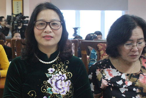 Giáo sư Nguyễn Thị Lan (áo xanh) tại buổi họp công bố giải thưởng sáng 1/3. Ảnh: Phan Minh.