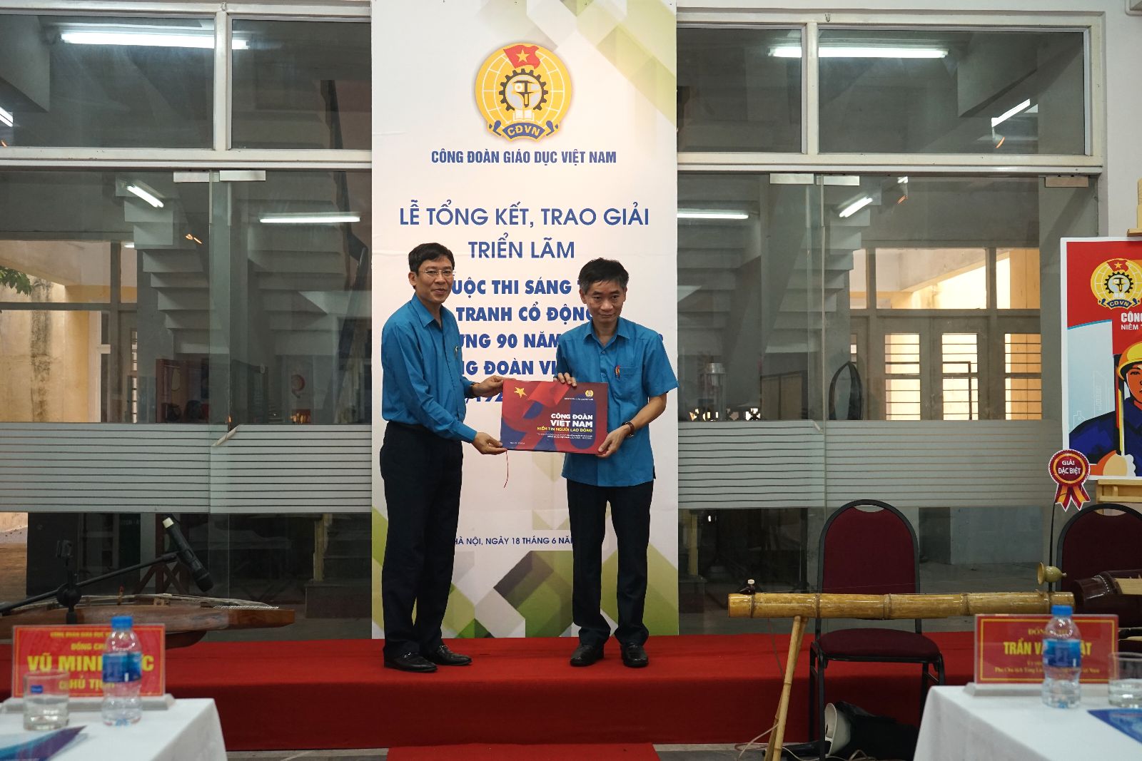 Đ/c Vũ Minh Đức - Chủ tịch CĐGD Việt Nam trao tặng phẩm cho Họa sĩ Lương Xuân Đoàn, Phó chủ tich Hội Mỹ thuật Việt Nam - Đại diện Ban Giám khảo cuộc thi